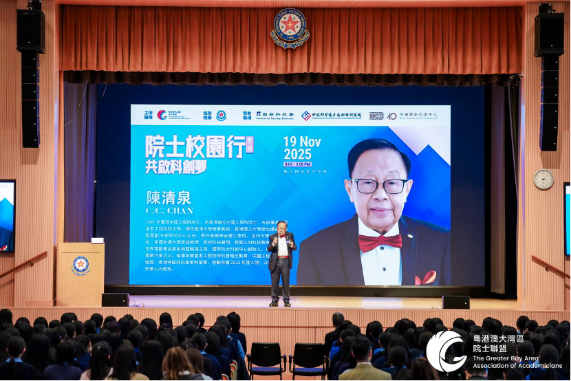 On the afternoon of November 19, The Great Bay Area Association of Academicians (GBAAA) extended its "Academicians on Campus" initiative to St. Stephen's Girls' College. The event featured a special guest—Professor C.C. Chan, Academician of the Chinese Academy of Engineering, Fellow of the Royal Academy of Engineering, Distinguished Chair Professor of The Hong Kong Polytechnic University, Honorary Professor of The University of Hong Kong, and Founder and Rotating President of the World Electric Vehicle Association. Professor Chan visited the campus to share his interdisciplinary research journey with over 300 teachers and students, delivering a talk titled "Aspiring High, Scaling New Heights—The New Journey of Energy and Electric Vehicle Revolutions." He provided an in-depth analysis of cutting-edge trends in the energy and electric vehicle revolutions, while also passing on the scientific spirit and the ethos of innovation.