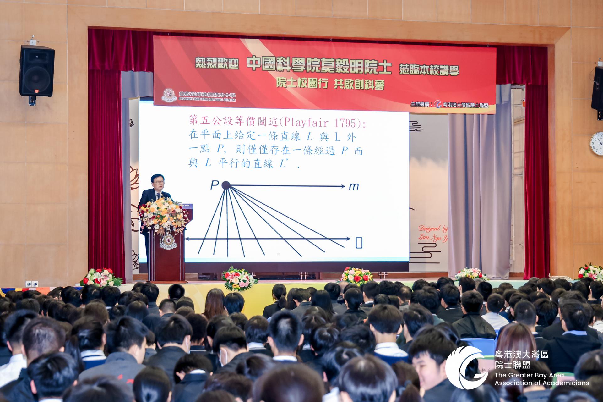 The event invited Professor Ngaiming MOK, an academician of the Chinese Academy of Sciences, to deliver a mathematics-themed lecture titled "Starting from Plane Geometry and the Square Root of -1" to over 700 teachers and students at the school.
